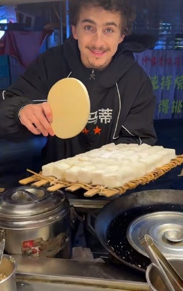 I was minding my own business, scrolling Xiaohongshu, when a thumbnail stopped me cold: a twinky white boy with a mustache, selling moldy tofu from a street stand. Xiaohongshu is one of the only platforms left where you actually have to click before seeing content in full. I did not click. AI-generated slop of Timothée Chalamet, my instinct said. Then I did a double take — because the caption read: Timotee Maimaiti (a common Uyghur name). Maybe a local Chalamet lookalike? I moved on. Hours later, the algo circled back, and I found out the truth: it was an authentic picture of Timothée Chalamet, selling dubious-looking tofu, on the street, in Chengdu.